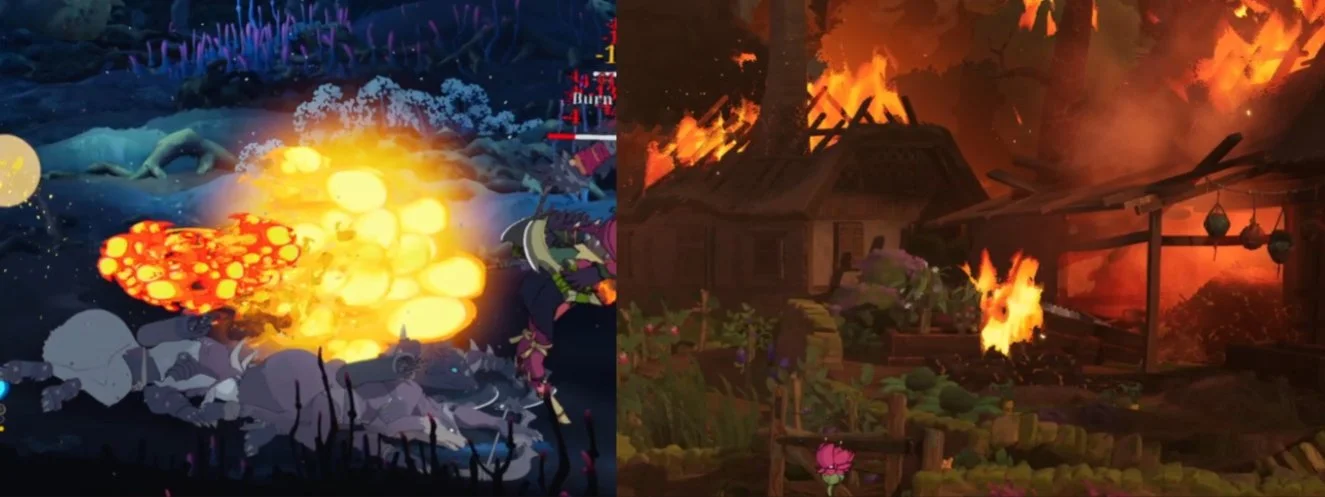The last challenge we faced as part of the development of Towerborne's style was how do we make elements in the environment feel different than those in combat. Fire is a prime example of something that exists in both environment & combat, are the same element type, but needed to feel different.