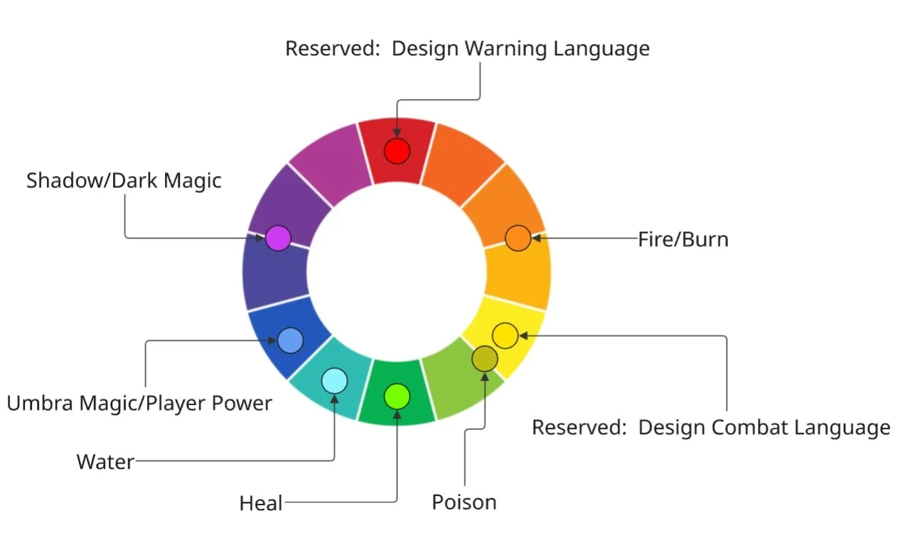 This color wheel example shows a simplified version of how certain color spaces were reserved for specific archetypes. This purpose driven approach to color space was crucial in achieving the final look of the game.