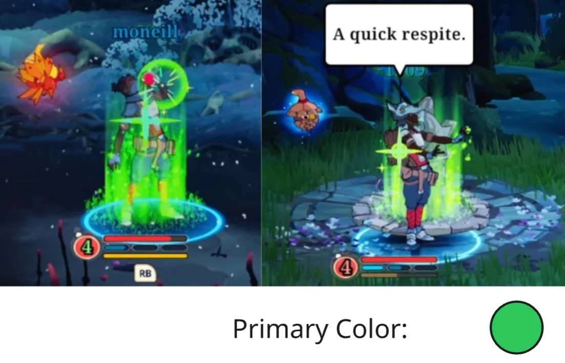 When considering the color green, it was important to reserve a very specific hue of green for pure gameplay language. Any gameplay effect that healed the player was reserved for the green color space. Healing was always a pure saturated green, unlike poison which was tinted yellow for better color separation.