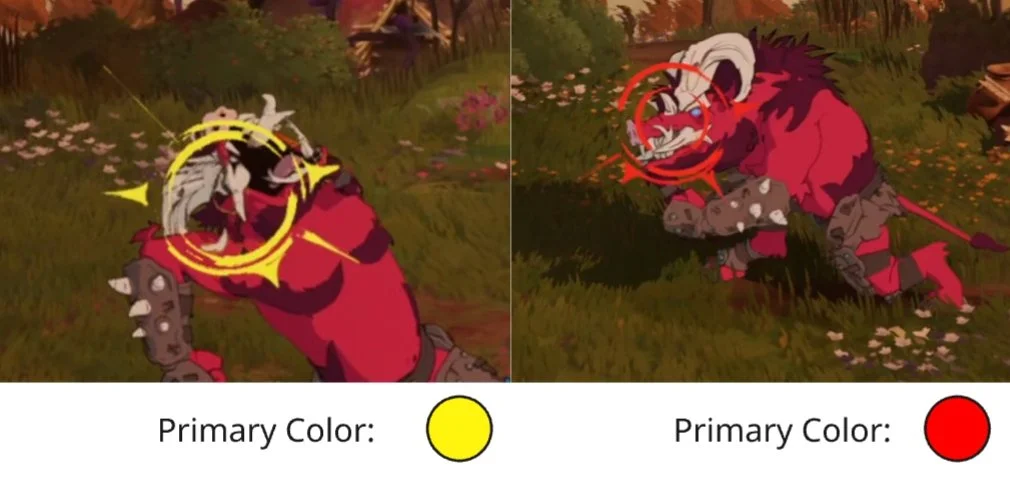 Like the healing effects, pure red and pure yellow occupied a very special place. They were restricted to specific critical information to the end user. In these two cases Yellow is used to call a user's attention to an attack that can be blocked. Red was used to tell players that an attack is unblockable.