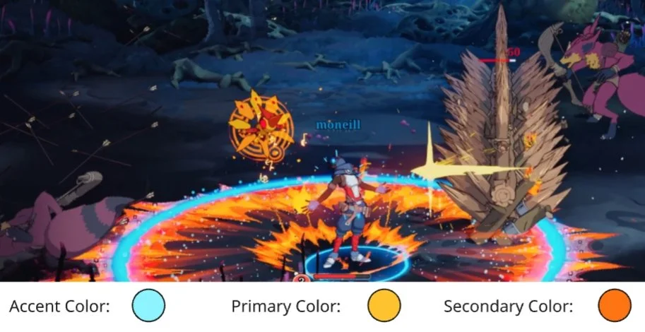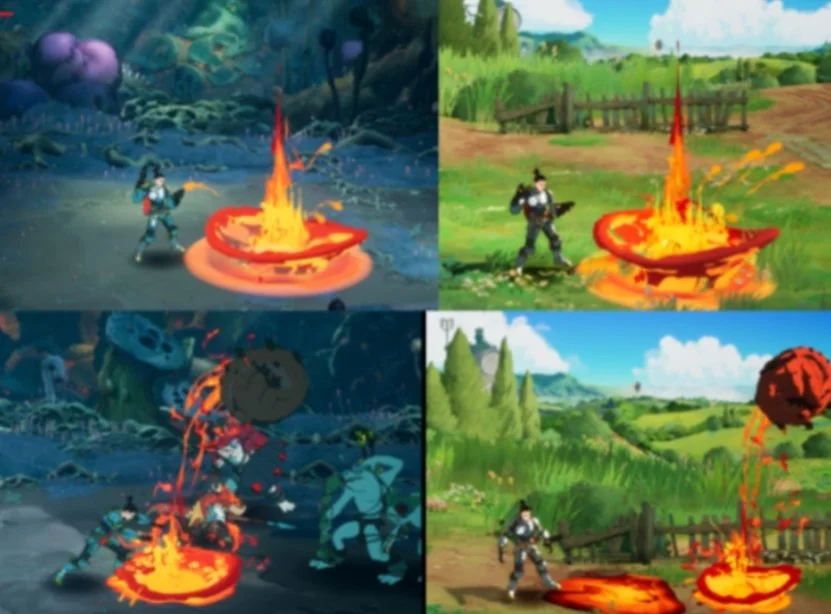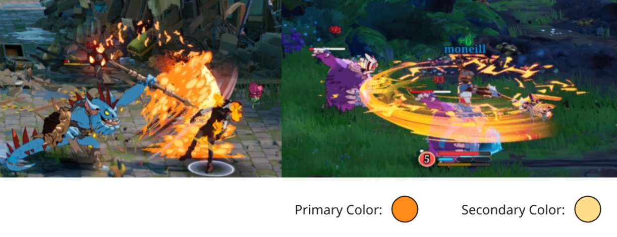 The stylistic choice we made was to give combat effects a clear distinction between primary and secondary colors. In the example above, you can see the combat fire on the left has hard edges and clear borders between primary and secondary colors. This compliments the tune shaded nature of our characters which also have hard borders between colors. Contrast that to the environment fire on the right where you can see gradients in value with softer blending between primary and secondary colors. This gave players a clear distinction between the two.