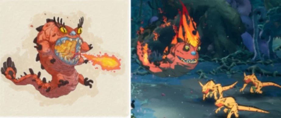 Some elemental archetypes had to be shared across enemy and player. Flame effects for example, follow the same color language regardless of if it is a player or an enemy. Making two different types of fire would create unnecessary noise and a lack of continuity. Stylistically certain elemental types had to have rules that were universal. Fire was orange, water was cyan, poison was green, ect. Ect.