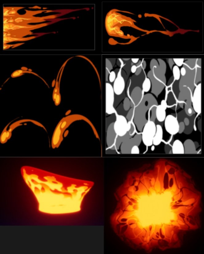 The basic idea was simple, use a primary and secondary color, focus on simplicity with as clean of a silhouette as possible. Stylized textures served as the base of each element. Procedural materials incorporated stylized masks all with the aim of creating channels for the primary and secondary colors. For elements that took up large areas of 3d space, simple geometrical shapes were used to fill the void. For Lava, the base colors would be saturated oranges and yellows, using high color value ranges to give the appearance of extreme heat.