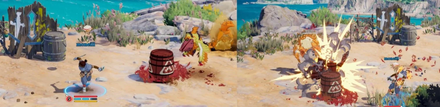 In the example above, you can see the contrast between a painted background prop and the red stylized exploding crab barrel (The design of the barrel was to have a horde of crabs lift up the barrel and try to guide it towards a player). The crab VFX are cel shaded and the explosion itself is crisp.
