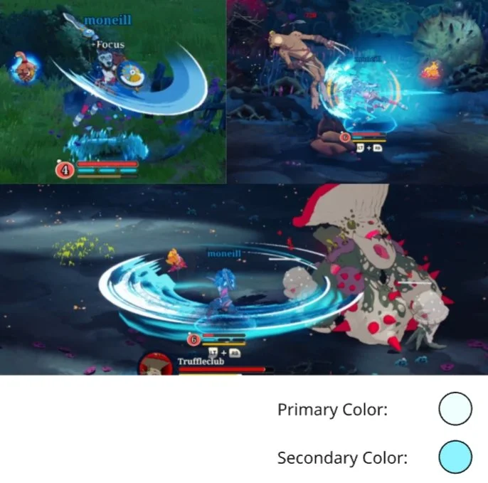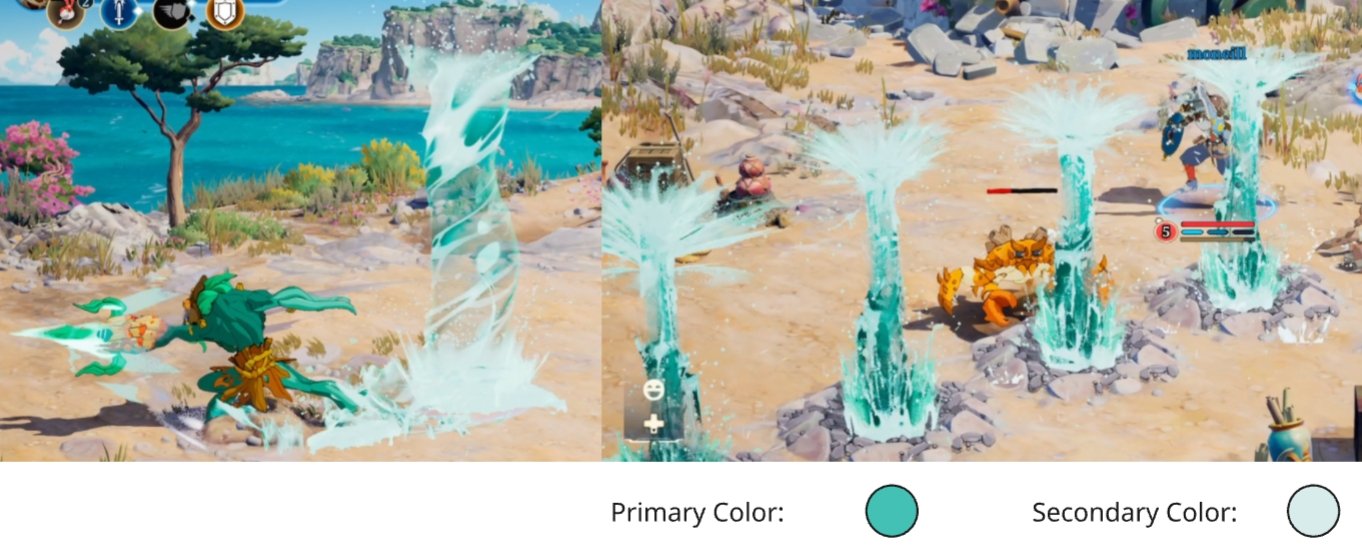 Similar to fire, water is another element that has to be universal not only to the players and enemies, but to the water seen in the environment. This posed a unique challenge due to much of Towerborne's color space being already blue. To give water its own space we opted to push a more cyan pallet with baby blue highlights.